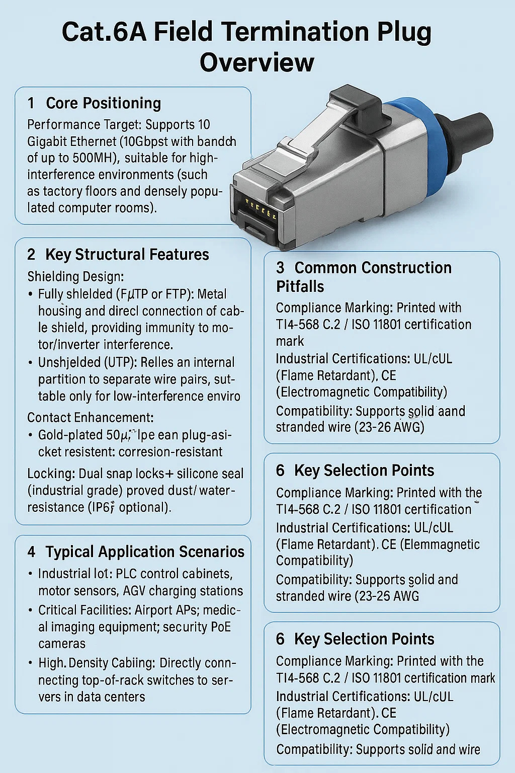 | Feature | Cat.6A Field Termination Plug | Standard Cat.6 Crimp Plug | Practical Impact |