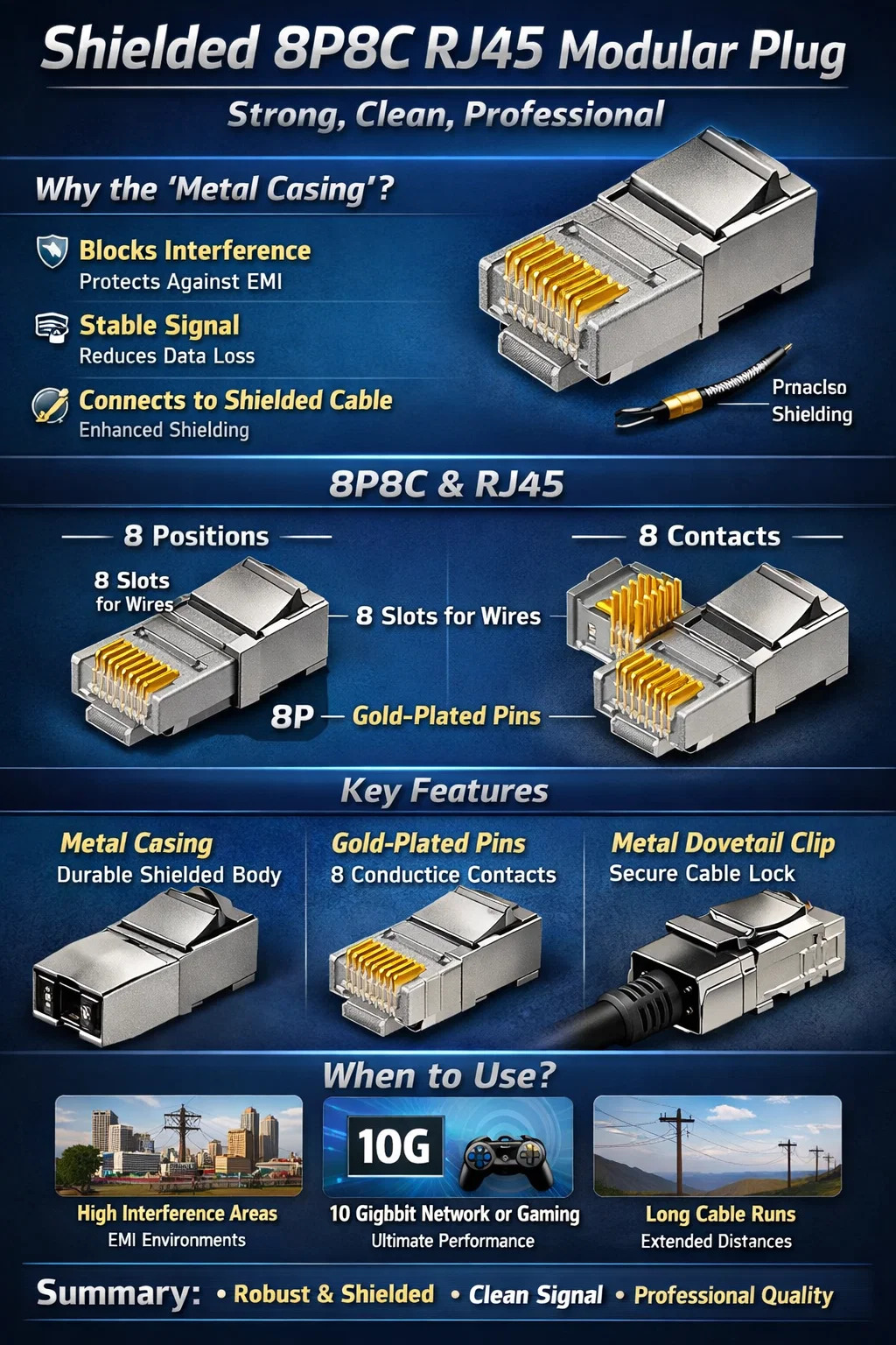 Hoc tuta 8P8C RJ45 modularis obturaculum vulgo dicitur ut "caput cristallum clipeum" vel "funis reticularis metallica iungo". Comparato communi perspicui generis, maxima eius differentia est lucidum "castra metallica" ambiente.
