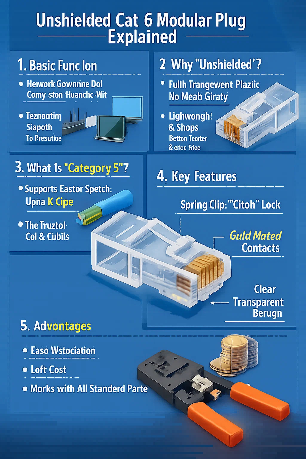 Contactus metallorum: In ipso fronte connectoris sunt octo parvi, contactus aeris flavi aurei. Cum forcipe eam inurunt, hae parvae noti aeneae velitatum filum pungunt et intus nucleum cupreum firmiter tenent. Materia perspicua: Quare diaphana? Ita facillime potes videre, si octo filis coloratis intus in recto ordine sunt cum funiculos retis faciendos, processum valde intuitivum faciens.